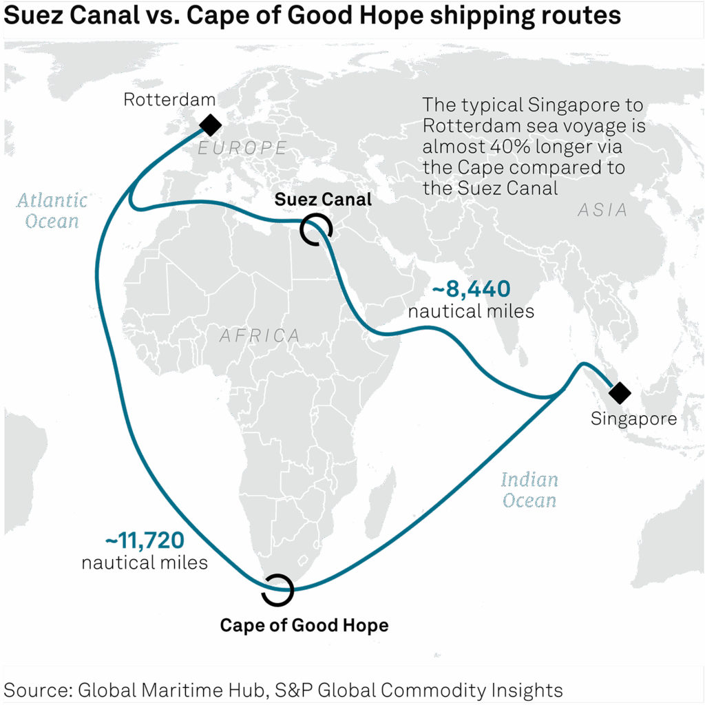 A konténerszállító hajók Szuezi tranzitja 64%-kal csökkent, a Jóreménység-fok körül 168%-kal nőtt.