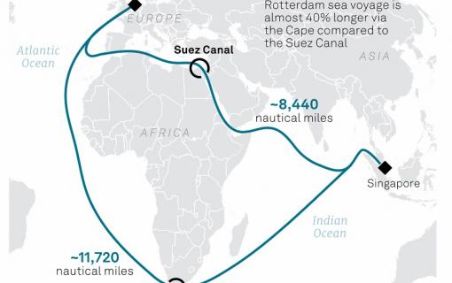 A konténerszállító hajók Szuezi tranzitja 64%-kal csökkent, a Jóreménység-fok körül 168%-kal nőtt.